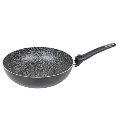 Space-saving wok pan. This pan can be stored compactly due to the folding handle. With sturdy and durable 5-layer SalusStone coating. Made from lightweight aluminum. Made from lightweight aluminum.