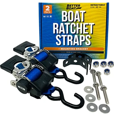 PREMIUM RETRACTABLE TIE DOWN STRAPS RATCHET SET: Our New Stainless Steel ratchet straps heavy-duty 2 inch wide are auto retracting ratchet tie down straps and allow you to travel securely with a working load of 600lbs & a break strength of 1800lbs. RETRACTABLE CONVENIENCE: Our retractable boat tie downs are easy to operate. Ratchet the buckle to tighten and simply press the button to auto retract. A Patented ratchet & release design make deployment,tightening,release and transit effortless. COMPLETE TIEDOWN KIT: Our boat trailer ratchet tie down kit includes two 2” x 43” blue nylon & black self retracting ratchet straps to use long or short & small. Attach with optional mounting arms & 4 sets of stainless bolts, washers & lock nuts. STRONG RELIABILITY: Our commercial grade auto boat tiedown straps are heavy duty, high density nylon and won't stretch or lose its strength after getting wet. The cargo or transom boat trailer straps are UV-resistant and won't curl over seasons. WHY BETTER BOAT: We are a family owned American business committed to making premium products including boating accessories, RV care, Jet Ski & boat cleaning supplies. We stand behind our rachet straps & marine grade boat trailer accessories.