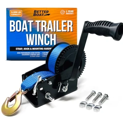 DURABLE SMOOTH HAND CRANK: Our smooth and effortless boat trailer winch helps easily pull your boat, jet ski or watercraft up onto your truck or car trailer. Rated for a 3200lb load with 2 speed 4:1 and 8:1 winch gear ratio and soft rubber grip. EASY TO INSTALL: Our boat winch easily bolts to your trailer with our included set of bolts, washers and lock nuts. Follow the detailed instructions to have your manual winch and 33 foot boat trailer winch strap with hook installed in no time. HEAVY DUTY CORROSION RESISTANCE: At Better Boat we specialize in marine grade products. Our boat winches for trailers are electrophoretic coated to prevent rust and corrosion over multiple seasons. Why buy towing winches from a brand you can't trust COMPLETE WENCHES FOR PULLING SET: Our hand crank winch features a heavy duty winch hook. The hand winch with strap, is pre-rolled with our marine grade boat winch strap with hook. Use the included bolting hardware boat parts for no headache install. WHY BETTER BOAT: We are a family owned American business committed to making premium boating accessories. We stand behind your satisfaction and our marine grade boat trailer accessories. Pair our winch with our ratchet straps heavy duty solutions.