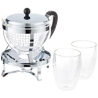 BODUM Chambord Set with Rechaud 1.5 L and 2 Pack of Double Wall Glasses Pavina 0.35 Tea Maker, multi layered, Black, 16.8 x 23.1 22.3 cm