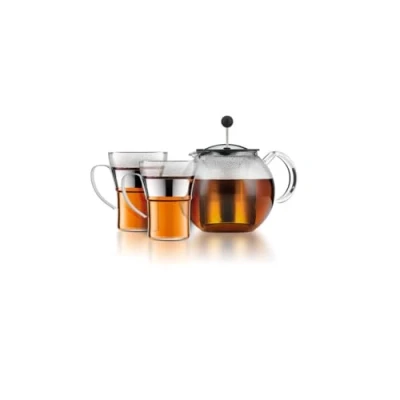 BODUM K1801 16CAR Assam Set Plunger Teapot with Lid and Stainless Steel Filter 1.0 L 2 Glass Cups Handle 0.35