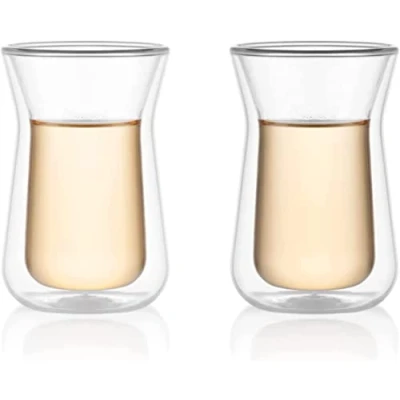 Elegant tea glass inspired by the shape of Moroccan mint tea glasses Innovative double-walled construction keeps hot and cold drinks at their respective temperature. Also perfect for small portions of soup and desserts. Made of mouth-blown borosilicate glass, heat resistant that will not alter or denature the taste of its contents. Hydrophobic silicone vent equalizes air pressure between the two layers of glass.