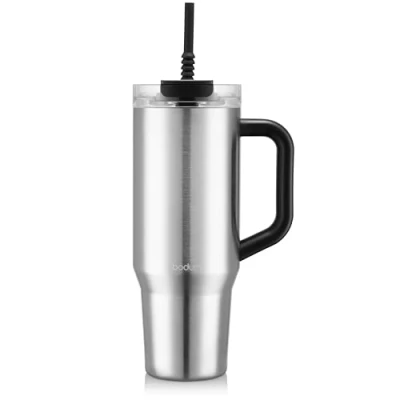 Bodum Travel Mug Tumbler 1.2 L Sleek Silver Metal Water Bottle with Straw, Handle and Lid Dishwasher Safe for Cold Drinks Warm Coffee
