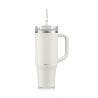 Bodum Travel Mug Tumbler 1.2 L Winter White Metal Water Bottle with Straw, Handle and Lid Dishwasher Safe for Cold Drinks Warm Coffee