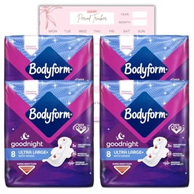 Body Form Ultra Goodnight Sanitary Towels with Wings, 32 (8 x4 Packs) Period Pads for Night use, Super Heavy Flow, Cour V Caliko Tracker