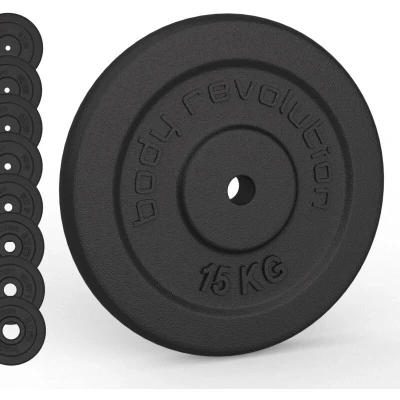 General description Introducing the Body Revolution Cast Iron Weight Plates, designed for durability and heavy-duty performance. These classic-looking, solid cast iron plates are built to withstand intense weightlifting sessions, offering long-lasting strength for both home and commercial gym setups. Available in sizes from 0.5kg to 25kg, these plates are perfect for fine-tuning your workout routine and targeting every muscle group. Technical specifications Material: Cast Iron Weight options: 0.5kg, 1kg, 2.5kg, 5kg, 10kg, 15kg, 20kg, 25kg Compatibility: 1-inch standard barbells and dumbbell bars Usage Ideal for exercises such as bench presses, squats, bicep curls, and deadlifts Designed for high repetition use, suitable for strength and conditioning programs Other information Each plate is embossed with weight identifiers and the Body Revolution branding for easy weight selection Compact and space-saving design, perfect for home gyms with limited space