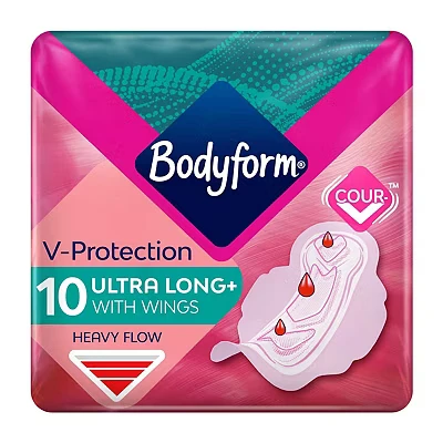 Bodyform Cour-V Ultra Long Sanitary Towels Wings 10 Pack provide superior period protection with Cour-V™ adaptive fit technology, ultra-long design and wings, and 3x smart absorption zones for maximum comfort and leak prevention. Eco-friendly and individually wrapped for hygiene and convenience.