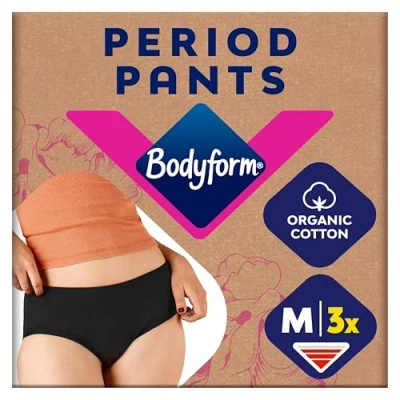 Choose the convenient 3 Pack of Bodyform hipster cut moderate to heavy flow period pants in classic black that keep you protected for up to 12 hours; all you need to feel dry when it’s your period New ComfortFit gusset designed for all women, adjusted by size: made for optimal fit and coverage, with reduced thickness around the edge to avoid unnecessary bulk Reliable and comfortable menstrual underwear made from stretchy, soft and breathable materials including ethically sourced organic cotton; oeko-TEX certified Long-lasting efficiency – each pair is equivalent to 3 pads; protect yourself and the planet – using these period pants means up to 88% less waste (compared to disposable products over 2 years) With the innovative TriTech Performance technology that combines 3 layers: absorbent to keep you dry, lock layer that keeps blood inside and breathable layer that lets air flow