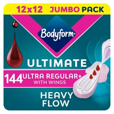 Bodyform Ultimate Ultra Regular Sanitary Towels Wings 144 Pack, Heavy Periods