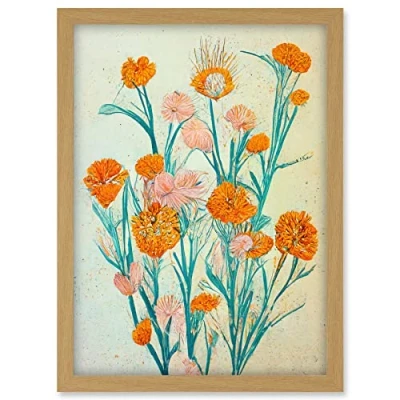 Boho Marigold Flowers Teal Orange Painting Artwork Framed A3 Wall Art Print