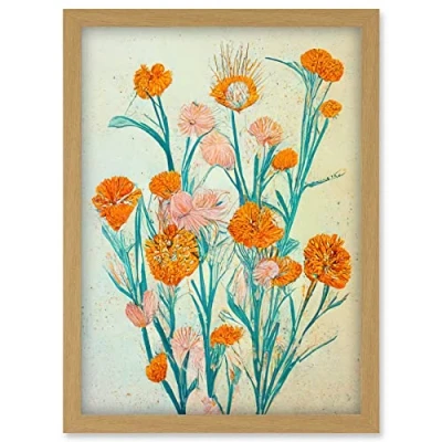 Boho Marigold Flowers Teal Orange Painting Artwork Framed Wall Art Print A4