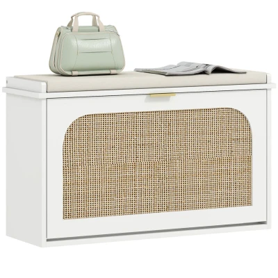 Boho Shoe Bench with Padded Seat and Flip Drawer, White Homcom