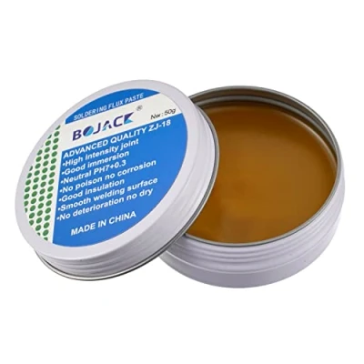 Product: Soldering Flux Paste Attributes: Neutral PH7 ±0.3; Net Weight 50g/1.8oz Function: Soldering electronic components. Anti-oxidation flux. Better welding fluidity. Easy to tin, easy to solder, strong welding. Feature: Non-toxic, no corrosion, high intensity joint, good immersion, good insulation, good soldering properties, smooth welding surface. Application: Soldering flux is suitable for welding on instruments, meters, gold, copper, iron, tin and other metals. Widely used in phone PCB, SMD, SMT patch and appliance repair., Manufacturer: BOJACK