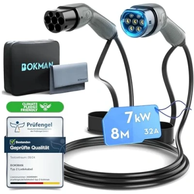 bokman Type 2 EV Charging Cable, Mode 3 / 32A 7.2KW 1 Phase 8 Meter, Electric Vehicle Car Plug in Hybrid to Fast Cable