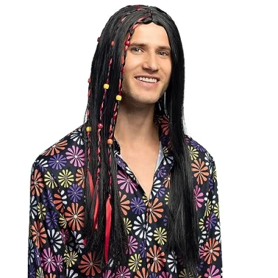 You will receive a flower power wig from the Boland brand The long, black hair extends to the chest Braided braids with red ribbons and beads make the hairstyle an eye-catching accessory Whether it's a hippie or flower power costume, this wig offers you the right hairstyle Combine with the matching costume (not included) from Boland, complete your great party outfit, Manufacturer: Boland