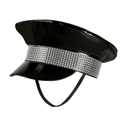 With this extravagant black rock hat, from Boland, you will be an eye-catcher at the costume or theme party. . The peaked cap in lacquer look is equipped with a wide, silver band. . The attached, black elastic band ensures a good hold on the head. transform yourself into a skirt with this headpiece. - Star or a punk. -Lady. Also suitable for fans of patent and leather, this accessory is ideal for fans of patent and leather. Combine the eye-catching hat with a matching costume from Boland (not included) to complete your party outfit, Manufacturer: Boland