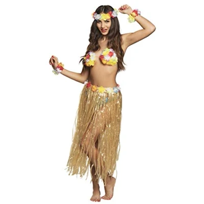 This is a Hawaii Paradise costume set by Boland. The Hawaiian costume set is 6 pieces and consists of a hula skirt, a shell bra with flowers, a flower necklace, two flower bracelets and a headband with flowers The skirt, made from beige plastic fringes, has a stretchy waistband and a length of approx. 75cm The shell bra is tied with nylon straps The bracelets and headband are also stretchy, and just like the other components of the set are decorated with colourful polyester flowers Welcome to Hawaii! Throw yourself in your bastard skirt and the hula party is ready to go. This great Hawaii costume set is perfect for the next carnival, theme or beach party., Manufacturer: Boland