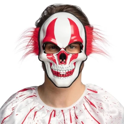 You will receive a skull clown mask with hair from the brand. Boland The scary mask is equipped with a black elastic band that ensures a good hold on the head It is available in red and white and has hair protruding on the side Put on this mask to stand out as a killer clown at the next costume party Combine the mask with a matching fancy dress costume (sold separately) from Boland to complete your creepy fancy dress, Manufacturer: Boland
