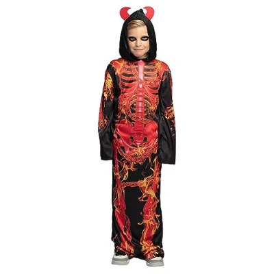 You will receive the children's costume fire skeleton from the brand. Boland The costume set is suitable for children aged 4 to 6 years Included is the long robe with hood The bone and flame pattern as well as the red devil ears complete the look as a creepy skeleton ideally Combine this children's costume with matching accessories (not included) from Boland to complete the Halloween fancy dress, Manufacturer: Boland