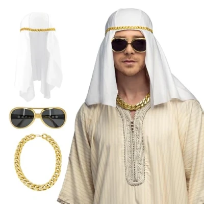 You will receive the costume set "Sheikh Faheem" from the brand. Boland It contains a white headscarf with golden wreath, the golden glasses and an eye-catching gold chain This eye-catching accessory is great for your fancy dress as a sheikh or Arab prince Pair with a matching Boland costume (sold separately) to create an exciting party outfit Ideal for carnival, cosplay and theme parties: the set is versatile and is sure to attract attention, Manufacturer: Boland