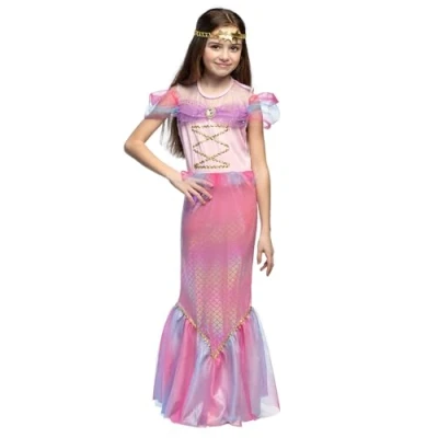 You will receive the mermaid costume Alana from the brand Boland It is ideal for children aged 7 to 9 years and corresponds to size 128/140 The long dress in mermaid look and a golden headband are included The costume is available in pink, purple and gold and is made of shimmering fabric and tulle The children's costume is ideal for carnival, a fairytale theme party or children's birthday party, Manufacturer: Boland