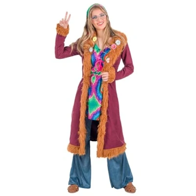 You will receive a multi-piece hippie costume from the brand. Boland The costume set for women comes in size XL The set includes the headband and a long coat with plush Furthermore, you will receive trousers with wide leg cuffs and a colourful blouse This costume is ideal for fancy dress, Halloween or theme parties, Manufacturer: Boland