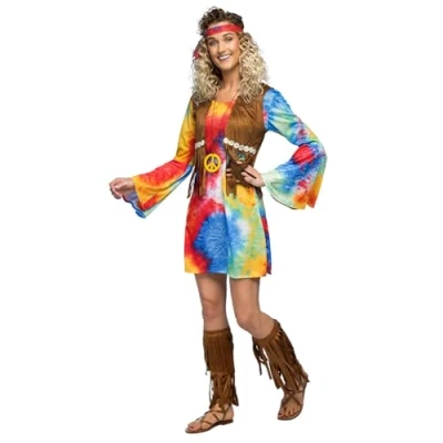 You will receive the hippie costume "Breeze" from the brand. Boland This costume includes a headband, peace pendant necklace, brown vest, dress and leg warmers The colourful women's costume comes in size 40/42 The dress including accessories comes in the style of the 70s - great for flower power events Complete this women's costume with a wig and sunglasses (not included) for the ultimate hippie style, Manufacturer: Boland