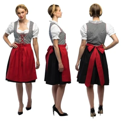 Beautiful 3-piece dirndl costume from Boland for women Set consists of a black and white dress with embroidery, white blouse and red apron Size 42/40 - for the right fit The fancy dress costume is ideal for the beer garden, a theme party or carnival Create a Bavarian party outfit with matching accessories (not included), Manufacturer: Boland
