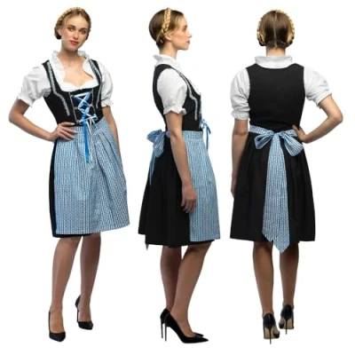 Beautiful 3-piece dirndl costume from Boland for women Set consists of a black dress with embroidery, white blouse and colourful apron Size 42/40 - for the right fit The fancy dress costume is ideal for the beer garden, a theme party or carnival Create a Bavarian party outfit with matching accessories (not included), Manufacturer: Boland