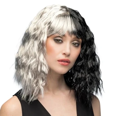 Expressive design: black and white hairstyle with eye-catching medium length wave cut Multi-purpose: wig suitable for Halloween, carnival, theme parties or cosplay events Character-strong style: tight cut fringes, slight waves edgy lines provide a strong appearance Transformation made easy: complements any outfit or fancy dress costume for a look with recognition value Eye-catcher for every role: whether witch, fashion icon or villain - this wig made of synthetic hair attracts everyone's attention