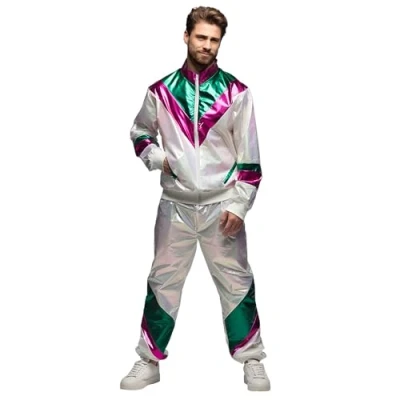 You will receive an extravagant tracksuit from the brand. Boland The costume set for men comes in size L The holographic jogging suit comes in 90s retro style with shimmering colours and metallic look Includes jacket and trousers with practical pockets This costume is ideal for fancy dress, Halloween or theme parties, Manufacturer: Boland