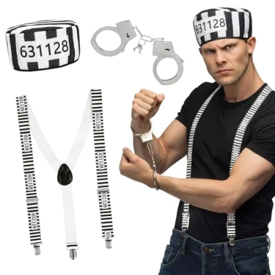 You will receive the costume set "Prisoners" from the brand. Boland A criminal set: includes hat, suspenders and handcuffs - everything you need for your costume All accessories are black and white striped Pair with a matching Boland costume (sold separately) to create an exciting party outfit Ideal for carnival, cosplay and theme parties: the set is versatile and is sure to attract attention, Manufacturer: Boland