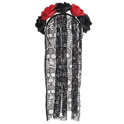 This is a Boland Day of the Dead Headband. The headband has the colour black, as well as the veil attached to it. The veil is made of an embroidered fabric with skulls. The headband has large flowers in the colours black and red. With this great headband, you have the ideal clothing accessory for the next Halloween or carnival party. By the way, not only Halloween is celebrated on 31 October, but in Mexico, from 31 October to 2 November, one of the most important Mexican holidays is Dia de los Muertos, also called the Day of the Dead. Here it is traditional to think of the deceased, by celebrating joyfully and exuberantly, similar to a carnival. The streets are colourfully decorated with flowers and skulls and you dress up as a skeleton or similar creepy costumes., Manufacturer: Boland
