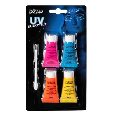 You will receive the multi-piece UV makeup set from the brand Boland The delivery contains 4 tubes of 10 ml UV Aqua Make Up in the neon colors pink, blue, orange and yellow You will receive an applicator to apply the makeup With this makeup you are the highlight of the dance floor, because the colors glow in UV light In combination with a wig and the matching outfit from Boland (sold separately), you can create an eye-catching look, Manufacturer: Boland