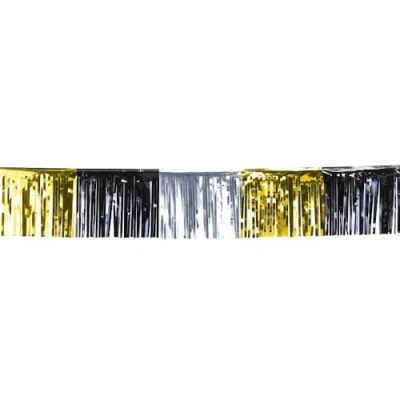 Shiny decoration: plastic foil fringe garland with metallic effect in gold, silver and black Generous length: 6 metres long, ideal for birthdays, theme parties, weddings or New Year's Eve Radiant look: reflective surface provides sparkling light plays in your home or garden Flexible use: easy to attach to the wall, ceiling or entryway with hooks or push pins (not included) Celebration atmosphere: set creative accents and create unforgettable party moments with this garland