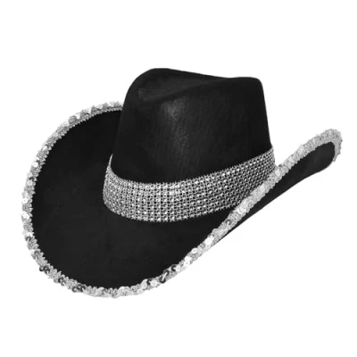 Eye-catching party hat: black cowboy hat with details for a unique glamour look SPARKLING JEWELLES: Wide hat band with glittering stones adds radiant accents Shiny details: silver sequins and a border on the edge provide the absolute highlight of this headpiece One size for adults: fits most head sizes and can be combined in many ways Eye-catching on the dance floor: reflects the light and makes the wearer the focal point of any celebration, Manufacturer: Boland
