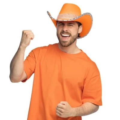 Eye-catching cowboy hat: bright orange with silver sequin trim and rhinestones Eye-catching for any party: the right hat for the Royal Day, the European Championship, World Cup or a festival Size 58 cm for adults: fits most head sizes and can be combined in many ways FESTIVE LOOK The shiny edge makes this cowboy hat a special focal point at any event Lightweight and durable material: stays well on your head even when dancing or outdoor parties, Manufacturer: Boland