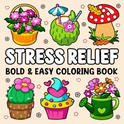Bold and Easy Stress Relief Coloring Book: Cute Stuffs, Animals, Landscapes, Flowers, Food Snacks Many More Simple Big, Designs Book For Adults Relaxation