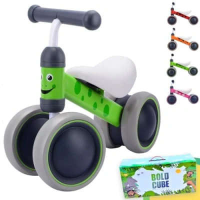 PERFECT FIRST GIFT: This baby balance bike arrives gift boxed and can help teach babies and toddlers encouraging them to learn coordination, balance and motor skills in their own time. This Baby Ride On is suitable for 6-18 months, and maximum rider weight is up to 20kg / 44lbs VEGAN LEATHER CUSHIONED SEAT: Large ergonomic seat designed with vegan leather casing & foam cushioned for comfort and hours of fun on this baby scooter. The seat is lifted at each end to support the baby maintain an upright position. Handlebars are also foam cushioned for an easy and comfy grip ANTI SKID WHEELS: The EVA silent wheels are designed wide and with anti-skid material to prevent slipping and support balance. Resting on a lightweight carbon steel tricycle frame. Our Babies first bike is suitable for both indoor or outdoor surfaces IMPROVES STRENGTH: Riding on a kids balance bicycle helps develop their muscle strength as well as balance. The balance bike’s steering is limited to 135 degrees to prevent the child from oversteering and losing balance. Fully tested to European EN71, CPSIA & ASTM Toy Safety Standards EASY TO ASSEMBLE: Easy installation within 5 minutes which includes the necessary tools and detailed visual instruction manual. Our friendly customer service team is on hand to help whatever your query, including video support :), Manufacturer: BOLDCUBE