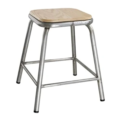 Bolero Galvanised Steel Low Stools with Wooden Seatpads (Pack of 4), Silver & Wood Colour, Industrial Urban Distressed Rusted Style Stools, Seat Height: 470 mm, DE478