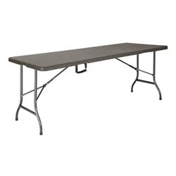 Euroffice728(H) x 1829(L) x 743(W)mm. Powder Coated Steel. Brown. Folding legs allow for easy transportation and space-saving storage, legs securely lock into place when table is opened. Suitable for indoor and outdoor use.