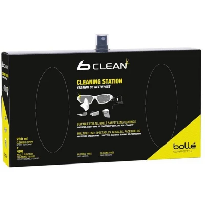 General description The Bollé Safety B410 b Clean Cleaning Station is designed for effective cleaning of safety lenses. It includes 400 multi-functional cleaning tissues and a 250ml cleaning spray that is both alcohol and silicone-free, ensuring safe use on various lens coatings. Technical specifications Number of cleaning tissues: 400 Cleaning spray volume: 250ml Composition: Alcohol-free and silicone-free Compatibility and accessories Suitable for all Bollé Safety lens coatings