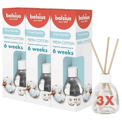 Enjoy a long-lasting fragrance experience with the Fresh Cotton-scented reed diffusers; the smart design of the bottle ensures the optimum placement of the three reed diffusers; thanks to the combination with the optimised vegan formula, these reed diffusers spread their delicious scent for up to 6 weeks The pure freshness of white cotton blossom is what gives Fresh Cotton its crisp, clean scent; it will remind you of freshly laundered cotton sheets hung outdoors to dry in the fresh air This collection combines iconic scents with natural extracts in an optimised vegan formula; the smart design of the bottle ensures the perfect positioning of the three reed diffusers, so the subtle scent gradually spreads through the room; up to 6 weeks; in addition, the reeds make it easy to adjust the fragrance intensity to your preference Choose your favourite fragrance from Bolsius's collection; it combines iconic fragrances with natural extracts; made with love for people and planet; experience the pure fragrance experience of these trendy fragrances and modern classics within the comfort of your own home Since 1870, Bolsius has been making quality products to create cosiness and a warm ambience in your home; doing this with passion, skilled craftsmanship and a love for people and planet; Bolsius inspires, connects and warms people with the magic of candlelight and fragrances that tickle the senses