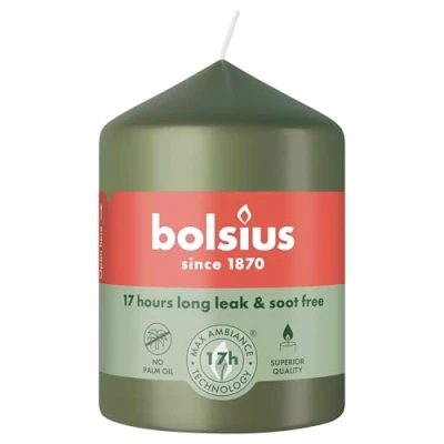 Discover the Essentials collection, the smooth pillar candles from Bolsius! This candle in the colour fresh olive is 8 cm high and thanks to our MaxAmbiance technology, drip free for up to 17 hours. This technology combines a unique formula with a specially selected wick for perfect burning performance. Made from vegetable wax and without palm oil. Ripe green olives with a deep, fresh colour - this is olive green. A shade that brings a Mediterranean touch to your home High-quality candles are characterised by their long burning time and their shape retention. bolsius Essential pillar candles have a smooth surface and do not drip. Our Max Ambiance technology combines a unique wax recipe with a super flat wick for perfect burning performance. Made with vegetable wax and no palm oil. Bolsius 'Essentials' candles with a smooth surface are essential in any interior. Different sizes and shades can be combined to suit your personal preference. Elegant and subtle. Crafted with our MaxAmbiance technology that combines a unique wax blend with a specially selected wick for perfect burning performance. Since 1870, bolsius has been producing high-quality candles and fragrances with which you can create an atmosphere of cosiness and well-being in your home. We do this with passion, know-how and with respect for people and planet. bolsius inspires, connects and warms people with the magic of candlelight and fragrances that excite your senses. Make every moment special. For you, and for everyone around you.