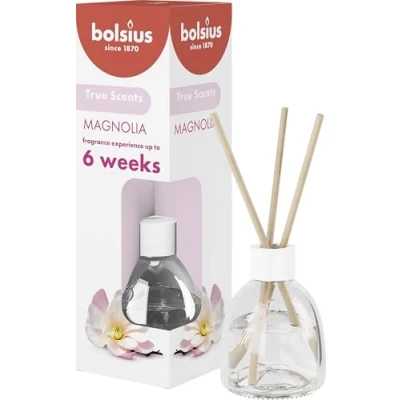 Enjoy a long-lasting fragrance experience with the Magnolia-scented reed diffusers; the smart design of the bottle ensures the optimal placement of the three reed diffusers; thanks to the combination with the optimised vegan formula, these reed diffusers spread their delicious scent for up to 6 weeks An absolute classic: With the soft fragrance of magnolia, white flowers and a hint of musk, you'll be imagining yourself in a field of flowers on a lovely summer's eve Iconic scents with natural extracts in an optimised vegan formula; the smart design of the bottle ensures the optimal positioning of the three reed diffusers, so the subtle scent gradually spreads through the room; up to 6 weeks; in addition, the reeds make it easy to adjust the fragrance intensity to your preference Choose your favourite fragrance from Bolsius's collection; iconic fragrances with natural extracts; made with love for people and planet; experience the pure fragrance experience of these trendy fragrances and modern classics within the comfort of your own home; crafted using CleanScent technology we guarantee the purest fragrance experience and the cleanest fragrance release Since 1870, Bolsius has been making quality products to create cosiness and a warm ambience in your home; we do this with passion, skilled craftsmanship and a love for people and planet; bolsius inspires, connects and warms people with the magic of candlelight and fragrances that tickle the senses