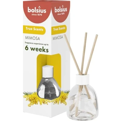 Enjoy a long-lasting olfactory experience with the True Scents Mimosa scented bouquet; the streamlined bottle design allows for flawless positioning of the three sticks Mimosa is a delicately powdery fragrance reminiscent of iris and flowering violets; enjoy this floral fragrance and transform your home into a comfortable home True Scents integrates iconic fragrances and natural extracts with an optimized vegan formula; the streamlined bottle design allows for impeccable positioning of the three sticks forming the fragrance bouquet, for a gradual diffusion of subtle fragrance into the room Choose your favorite fragrance from Bolsius' True Scents collection; true Scents combines iconic fragrances with natural extracts; made with love for people and the planet Since 1870, Bolsius has been making quality products that create comfort and ambiance; we do it with passion, artisan way and with love for people and the planet