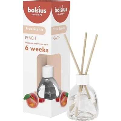 Enjoy the fruity fragrance of Bolsius Peach sticks, fresh and soft, for up to 6 weeks; with Freshplex molecules that neutralize the smell of cigarette smoke; a fragrance that will make you smile The fruity scent of a juicy peach transports you into the sweetness of summer days; enough to change your mindset and your interior True Scents integrates iconic fragrances and natural extracts with an optimized vegan formula; the streamlined bottle design allows for impeccable positioning of the three sticks forming the fragrance bouquet, for a gradual diffusion of subtle fragrance into the room Choose your favorite fragrance from Bolsius' True Scents collection; true Scents combines iconic fragrances with natural extracts; made with love for people and the planet Since 1870, Bolsius has been making quality products that create comfort and ambiance; we do it with passion, artisan way and with love for people and the planet