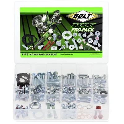 Bolt motorcycle hardware is located on the beautiful central coast of california, where they design, assemble, package and ship their hardware kits. Kx / kxf pro-pack contains factory style hardware including: m6 & m8 flange bolts and shoulder bolts for shroud, seat, sub-frame, & fork guard, rotor bolts, a full set of sprocket bolts, counter shaft lock washers, t-nuts, valve stem grommets & caps, chain slider hardware, brake master cylinder bolts, fuji lock nuts, and drain plug washers, and thread chasers. Also includes 22mm metal locking axle nut to eliminate stock castle nut/cotter pin. Fits full size model years 2003-current.
