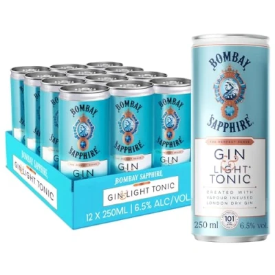 One 12 pack of 250 ml cans of Bombay Sapphire Gin and Light Tonic Ready to Drink Cocktail Canned cocktails combine Bombay Sapphire Gin with perfectly balanced light tonic water at only 101 calories (per 250ml serve) 100% vapour-infused gin adds bright and vibrant botanical flavours to these premade cocktails Expertly mixed for a bar-quality alcohol drink that delivers our signature gin and tonic experience Enjoy these canned drinks chilled or over ice with a slice of lime, anywhere and for any occasion
