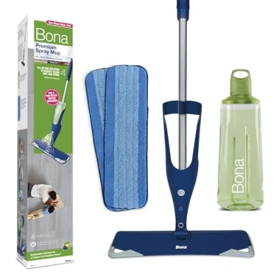 KIT INCLUDES: 1x Bona Premium Spray Microfibre Mop, 1x Prefilled Bona Hard-Surface Floor Cleaner Liquid Cartridge, 850ml & 2x Bona Microfibre Cleaning Mop Pads. CLEAN & PROTECT: Drop the spin mop and buckets sets! With each pull of the trigger the Bona spray mop dispenses just the right amount of solution for a perfect clean without oversaturating your floors which can cause damage. Forget about filling up a messy mop bucket - just spray for a quick and effective clean! MACHINE WASHABLE PADS: Spray mop with washable pads? The Bona Premium Spray Mop comes with 2x washable microfibre mop pads. The microfibre cleaning pads are made from over 90% recycled materials and impresses with its unique two-zone design for intensive absorption of dirt The reusable microfibre cleaning pad can be washed and re-used up to 500 times for a more sustainable world. REMOVES 99% OF BACTERIA: Bona Microfibre Cleaning Pads remove 99% of E. coli and Listeria from wood or LVT flooring when using with Bona Wood Floor Cleaner, Bona Hard-Surface Floor Cleaner or water; Tested at an independent accredited lab. REFILLABLE BOTTLE: The prefilled Bona Hard-Surface Floor Cleaner Liquid Cartridge is refillable. Economy sized refills are available to refill the spray mop bottle with your favourite Bona Cleaner. The pH-neutral formula is ready to use, dries quickly and leaves behind nothing but a streak-free natural shine.